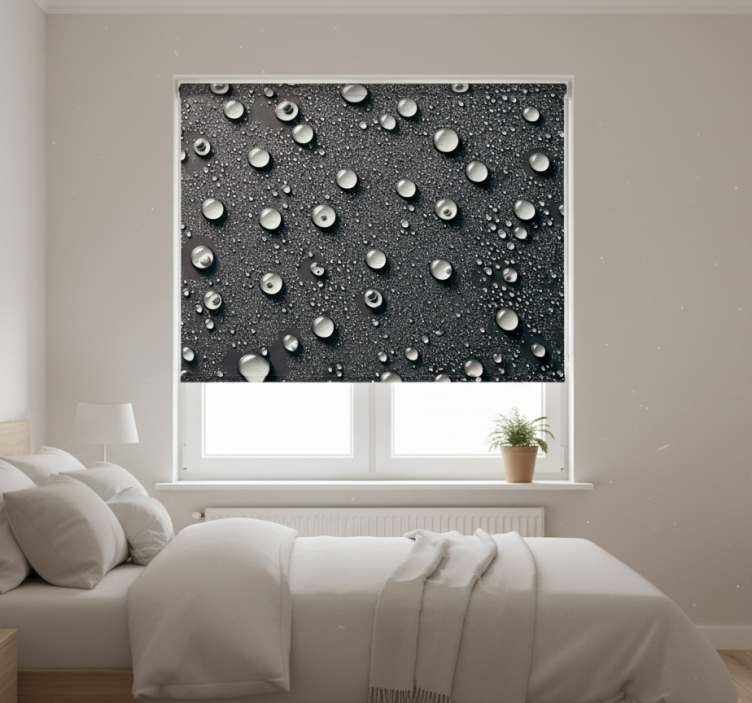 一个引人注目的设计,展示了一系列水滴散布在有纹理的表面上。每个水滴的大小各异,形成了动态的视觉效果。水的反射特性增强了整体美感,与背景形成了有趣的对比。
