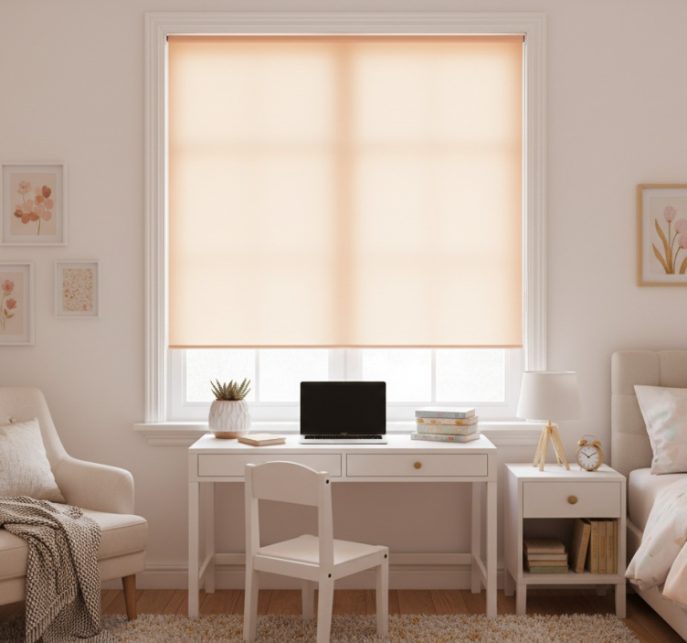 一扇柔和的桃色窗帘轻柔地过滤光线,营造出温暖的光晕。附近,一个装饰性花盆里放着一株多肉植物,为空间增添了一抹绿色。带有精致花卉设计的艺术作品与宁静的氛围相得益彰,而简约的桌椅则提供了一个功能性的工作空间,完美融合了舒适与风格。