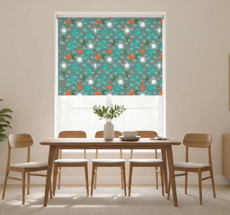 一个生动的设计,融合了橙色和绿色的多种色彩花朵,点缀着精致的叶子。圆形的装饰增添了节奏感,提升了整体的视觉吸引力。背景的丰富色调提供了鲜明的对比,形成了一个引人注目的图案,非常适合生动的装饰。