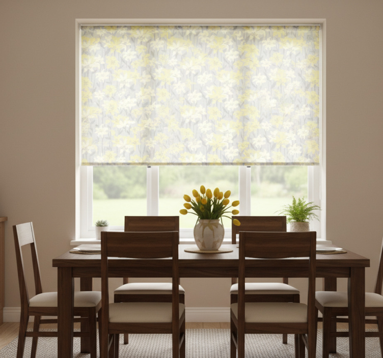 一个生动的图案展示了黄色和白色的花朵,背景是微妙的灰色。每朵花都精致细腻,与柔和的绿色茎和叶子相得益彰。这个愉快的设计将自然的感觉带入室内,唤起清新和活力的情感。