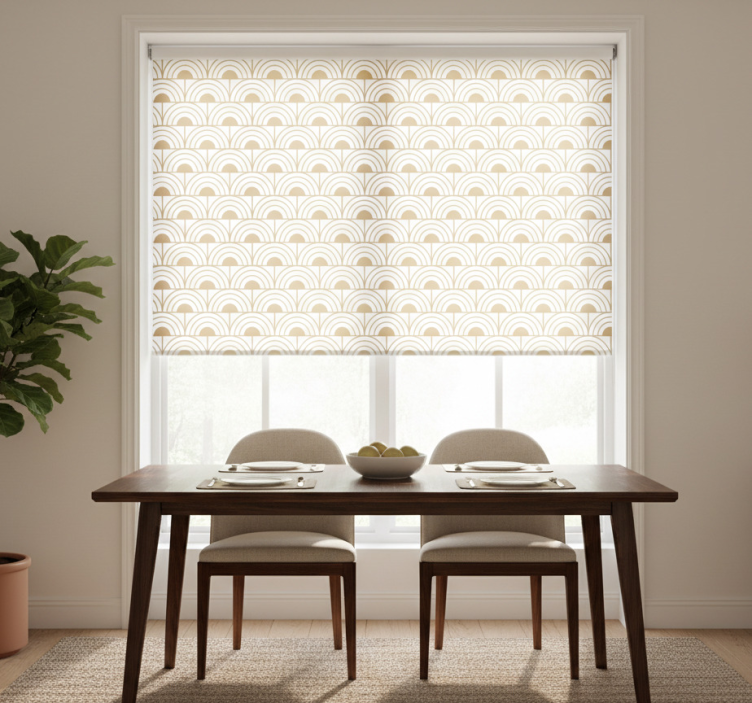 在您的dining room roller blind 盲人餐厅金色渐变弧形艺术装饰图案中,您只需简单地将其安装在窗户上,便能轻松提升整体装饰效果。通过调节链条,您可以轻松控制光线的进入,营造出理想的用餐环境。