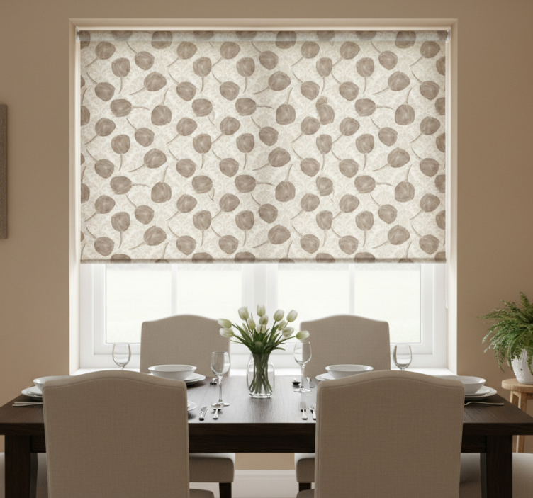 这款dining room roller blind盲人餐厅灰色郁金香图案与卷叶装饰非常适合在餐厅、客厅或任何需要隐私保护的空间使用。您只需轻轻一拉便可调节光线,随时享受理想的室内环境!