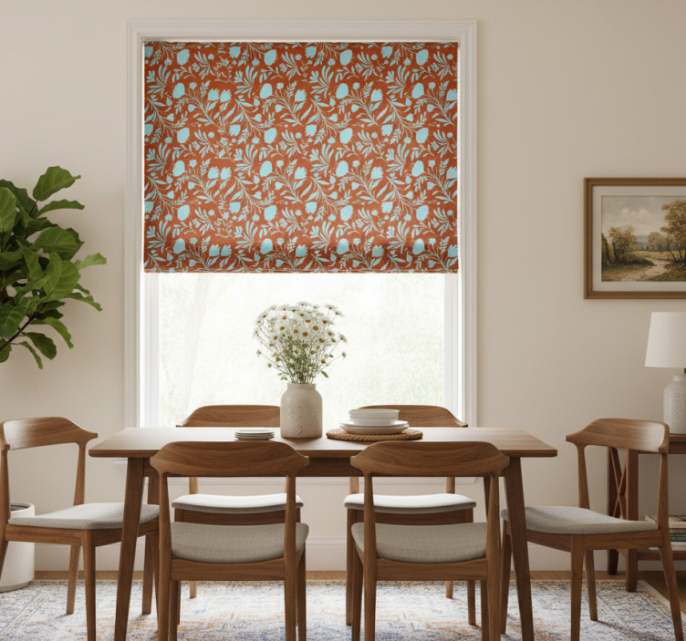 一个生动的图案展示了一系列花卉和植物,柔和的蓝色调与丰富的赤土背景形成美丽的对比。这个设计捕捉了生机勃勃的自然精髓,以其细致的花卉和植物图案为任何环境带来清新和创造力的感觉。