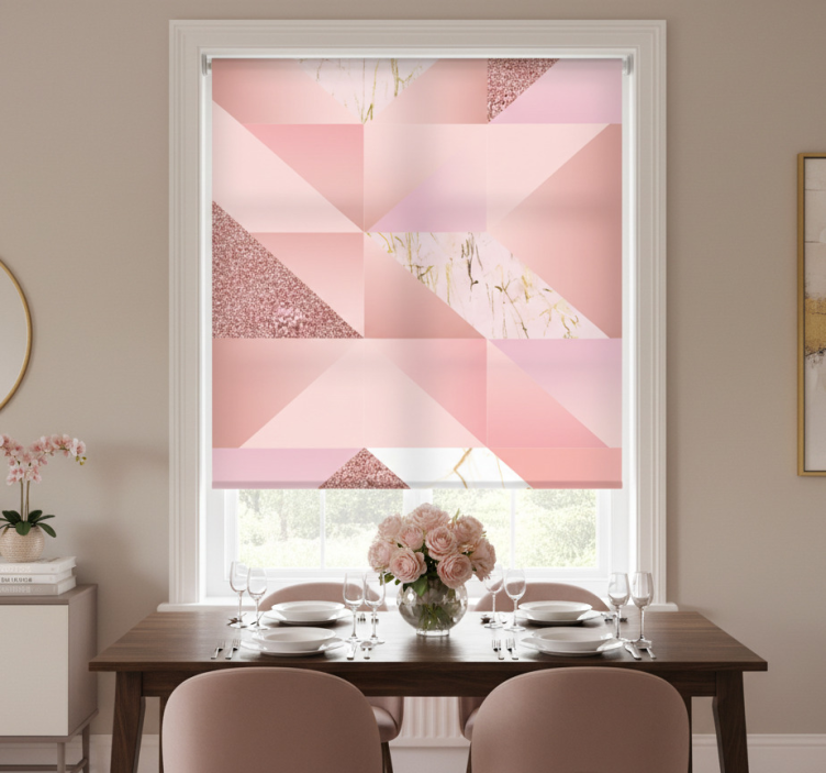 该设计呈现出一系列三角形状,采用不同深浅的粉色,巧妙地与大理石白和金色的细微点缀交织在一起。闪亮的纹理增添了深度,创造出引人注目的动态视觉效果,提升了任何美学的魅力。