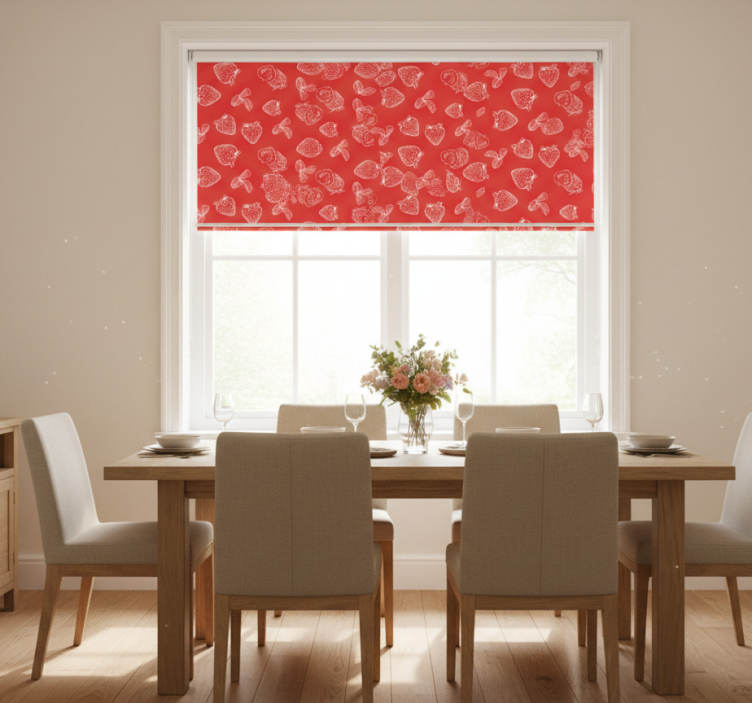 鲜艳的红色背景上绘有复杂的草莓和蝴蝶结图案,形成了引人注目的组合。每个草莓都设计得细致入微,展现出艺术的风格,为任何空间增添了生动的气息。这种俏皮的设计激发了快乐和清新的感觉。