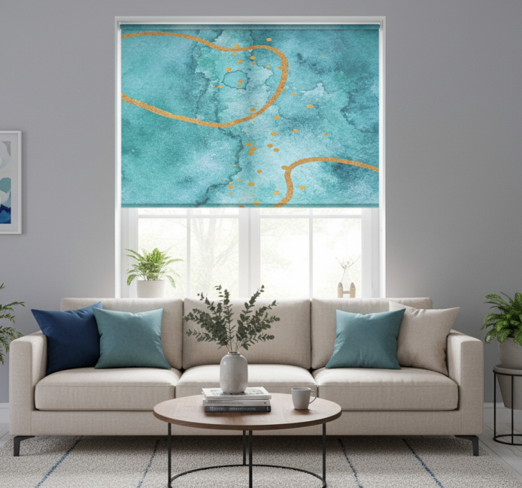 使用盲人客厅设计抽象海蓝色与金色,您可以轻松地为客厅增添一抹亮丽的色彩。只需将其挂在窗户上,便能享受到既时尚又实用的效果,完美适应各种家居风格。它的设计使得光线的调节变得轻而易举,为您创造一个舒适的生活环境。