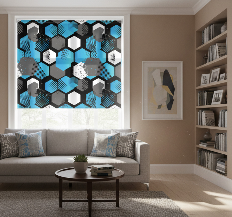 一个引人注目的图案展示了交错的六边形形状,呈现出不同深浅的蓝色、灰色和黑色。设计中融入了点状纹理和充满活力的飞溅元素,营造出运动感和深度感。非常适合现代装饰,它将城市美学与优雅相结合。
