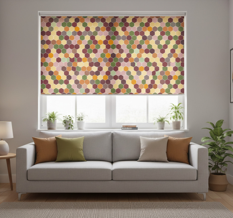 这个设计采用了生动的六边形形状排列,和谐地融合了包括橙色、绿色和酒红色在内的自然色调。色彩的交织创造出一种生动而又舒缓的视觉效果,非常适合为任何空间增添一抹欢快的气息。