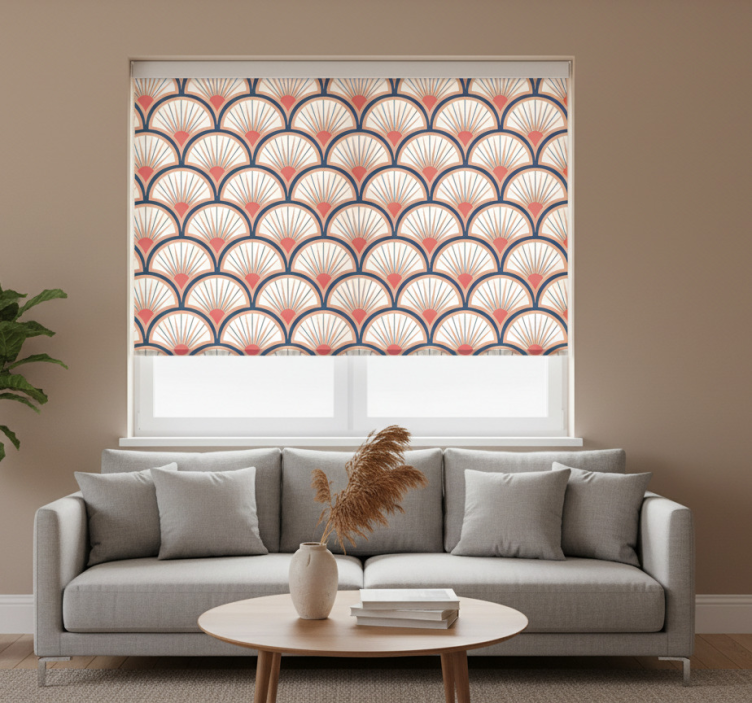 这个设计以交错的扇形图案为特色,结合了珊瑚色和海军蓝的色调,辅以细腻的线条和日光辉映的点缀。生动的拱形创造了一种节奏感和动感,使其成为任何装饰风格中引人注目的补充。