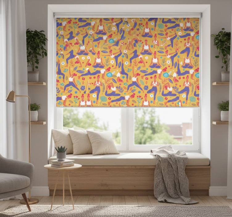 一幅生动的插图,描绘了多个人物在明亮的黄色背景下进行各种瑜伽姿势。精致的花朵和郁郁葱葱的叶子为场景增添了清新的气息。鲜艳的色彩和动态的形态创造出一种令人振奋的视觉效果,促进身心健康与宁静。