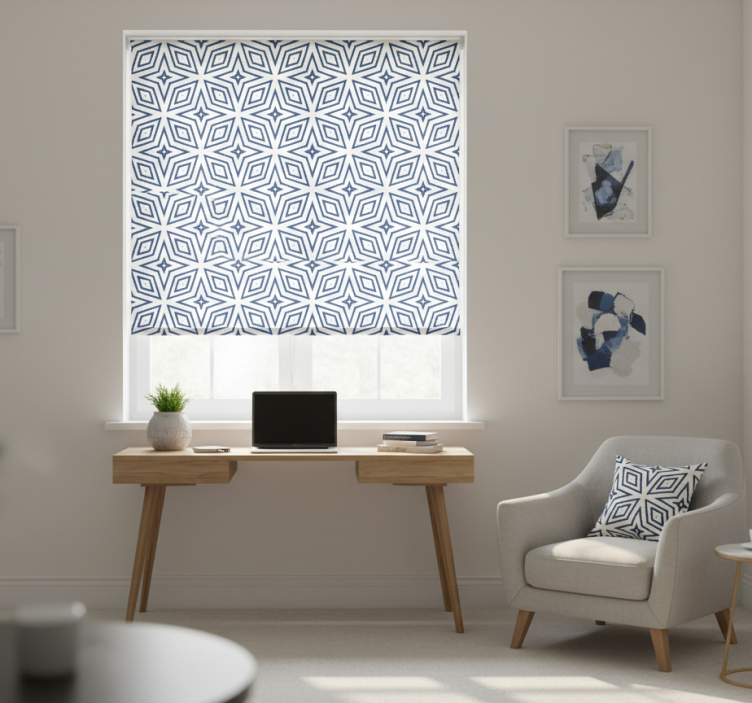 一个引人入胜的设计,采用重复的星形图案,由相互交错的几何形状构成。复杂的布局形成了一种视觉上令人愉悦的钻石和三角形的排列,每个形状都用鲜明的蓝色勾勒。这个图案为任何装饰风格增添了现代感,体现了一种秩序和优雅。
