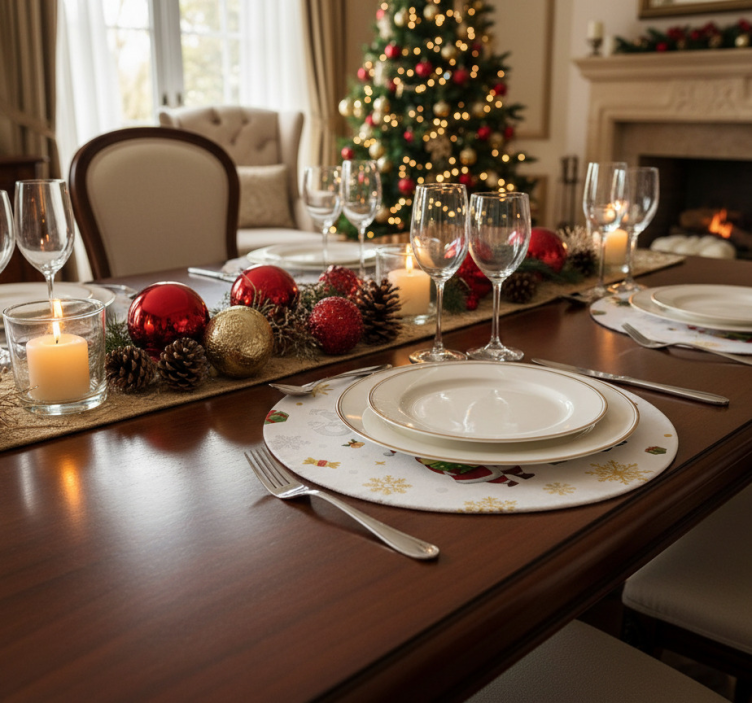 一张优雅布置的餐桌上装饰着节日的装饰品,包括闪闪发光的饰物和松果。温暖的烛光营造出温馨的氛围,背景中可见一棵装饰精美的圣诞树,增强了节日的气氛。餐桌已准备好迎接庆祝和团聚。