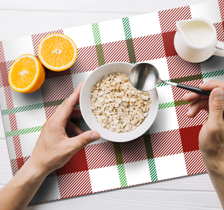 一种节日格子图案呈现出鲜艳的红色和绿色条纹,采用传统的棋盘设计,非常适合节日聚会。对称的布局增强了任何桌面设置,为圣诞庆祝活动营造了欢快的氛围。