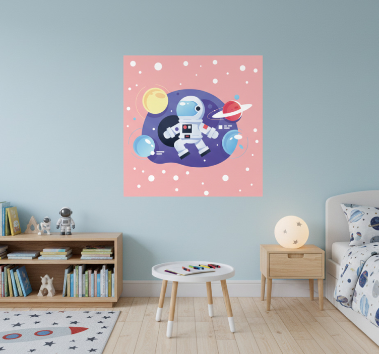 这幅生动的插图描绘了一位快乐的宇航员漂浮在一个奇幻的太空场景中。围绕着这个角色的是五彩缤纷的行星、气泡和星星,背景是柔和的粉色。这种俏皮的设计唤起了冒险和奇妙的感觉,非常适合儿童房间或教育空间。