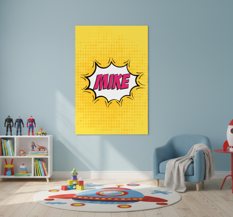 这幅生动的图像呈现了一个大胆的漫画风格设计,名字 'MIKE' 以粉色字母显眼地展示在前。明亮的黄色背景上装饰着点状图案,营造出一种玩乐的氛围。非常适合增加个性化的触感,这幅艺术作品非常适合儿童房间或充满趣味的空间。
