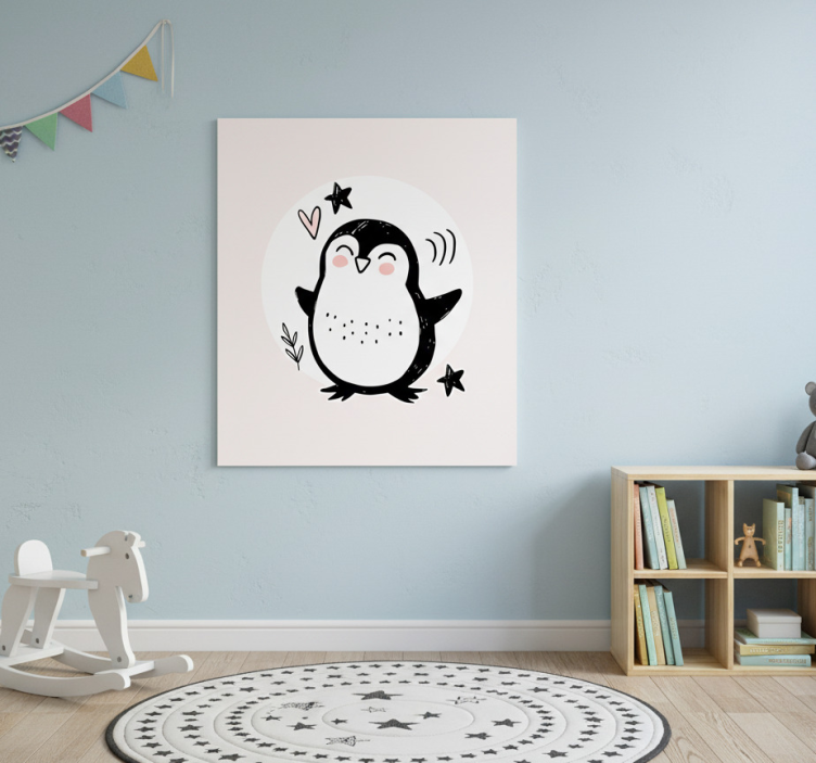 这幅富有幻想的插图描绘了一只快乐的企鹅,身穿简单的黑白服装,展现出愉悦的表情。角色周围环绕着一些俏皮的元素,包括一个心形和星星。背景色调柔和,增强了迷人的氛围,非常适合儿童房间的装饰或趣味艺术作品。