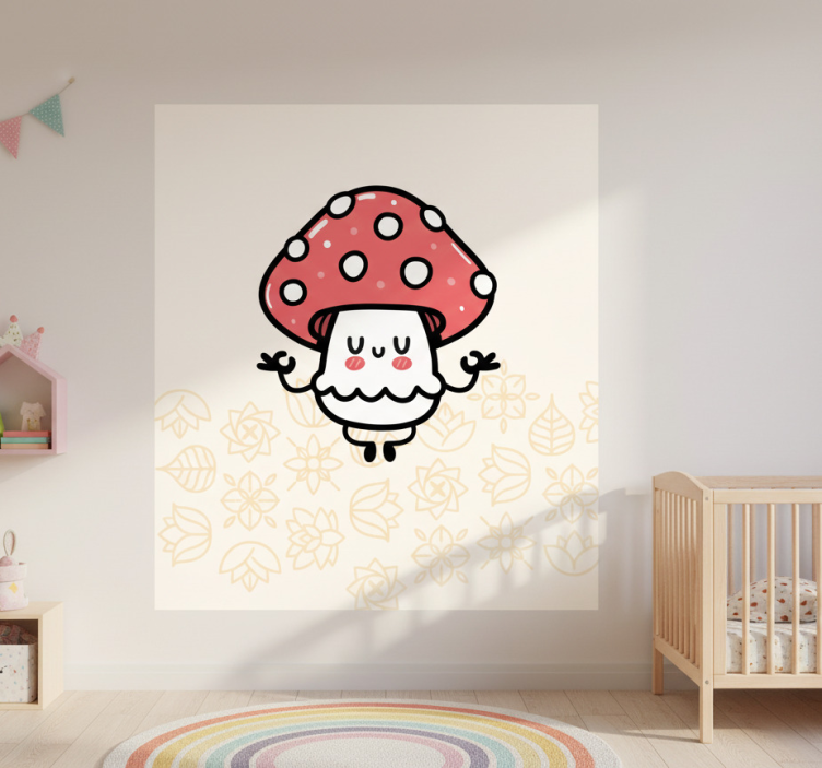 这幅可爱的插图展示了一个顽皮的蘑菇角色,鲜艳的红色帽子上点缀着白色圆点。它在微妙的花卉图案和叶子的背景上快乐地漂浮,散发出一种异想天开的愉悦氛围。非常适合儿童装饰,为任何空间增添了想象力和魅力。