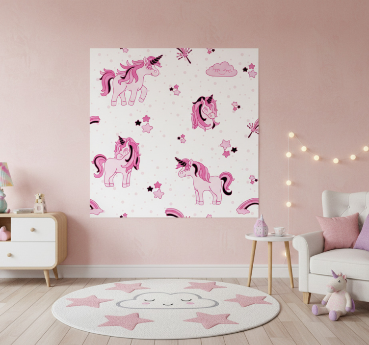 这幅图像展示了一款充满奇幻色彩的以独角兽为主题的墙纸,上面装饰着顽皮的独角兽、星星和云朵的插图。鲜艳的粉色调营造出一种愉快的氛围,非常适合儿童房间。精致的设计,包括闪烁的元素,增强了空间的迷人和魔幻气息。