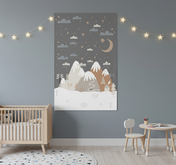 这幅富有幻想的艺术作品描绘了一个宁静的冬季景观,点缀着风格化的山脉、散落的云朵和遥远的月亮。柔和的雪覆盖的前景与迷人的树木和温馨的房屋相得益彰,营造出一种宁静的氛围。柔和的粉彩色调和谐地融合在一起,使其成为任何儿童房间或温馨空间的迷人装饰。