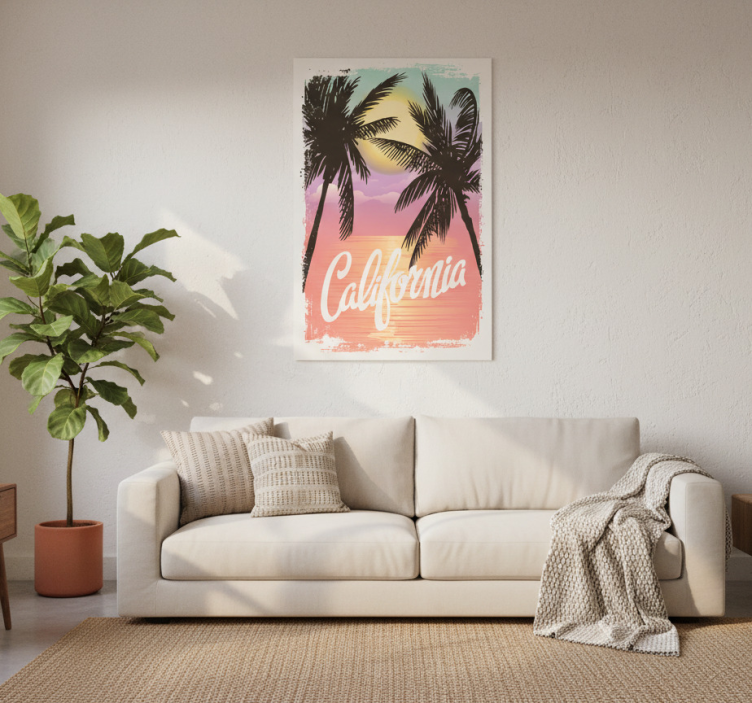 这幅生动的艺术作品描绘了棕榈树在美丽的日落背景下的剪影,色调柔和的粉色和橙色交织在一起。单词 'California' 以时尚的草写字体显著展示。这件作品完美地捕捉了轻松的海岸生活方式的精髓,非常适合家庭或办公室的装饰。