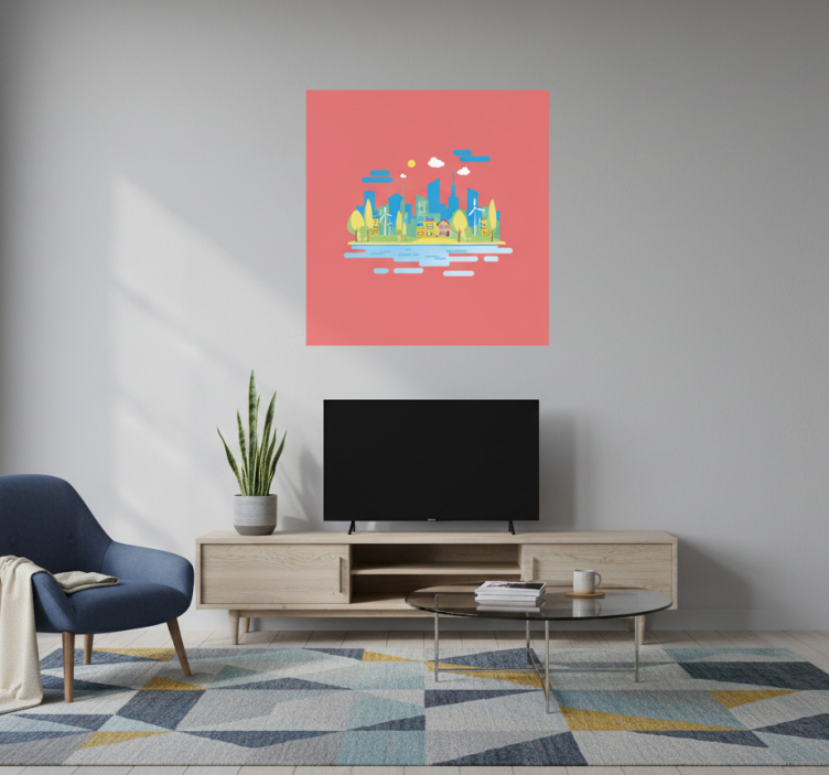 这幅色彩斑斓的插图展示了一个生机勃勃的城市景观,周围环绕着郁郁葱葱的树木和宁静的水体。明亮的建筑配有太阳能电池板和风力涡轮机,突显了可持续性。清澈的天空中漂浮着顽皮的云朵和闪耀的太阳,增添了温暖,使这幅艺术作品非常适合现代居住空间。背景是一片柔和的粉色。
