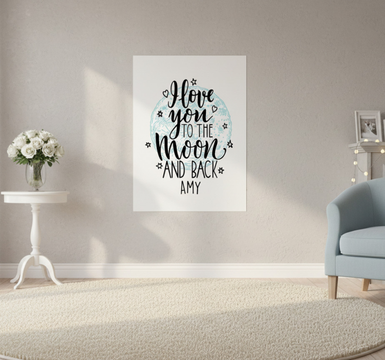 这幅图像展示了一句温馨鼓舞人心的名言,采用了精美的排版。文本 'I love you to the moon and back' 被轻蓝色的月亮插图和小星星艺术性地框住。这个迷人的设计增添了个人风格,非常适合家庭装饰。