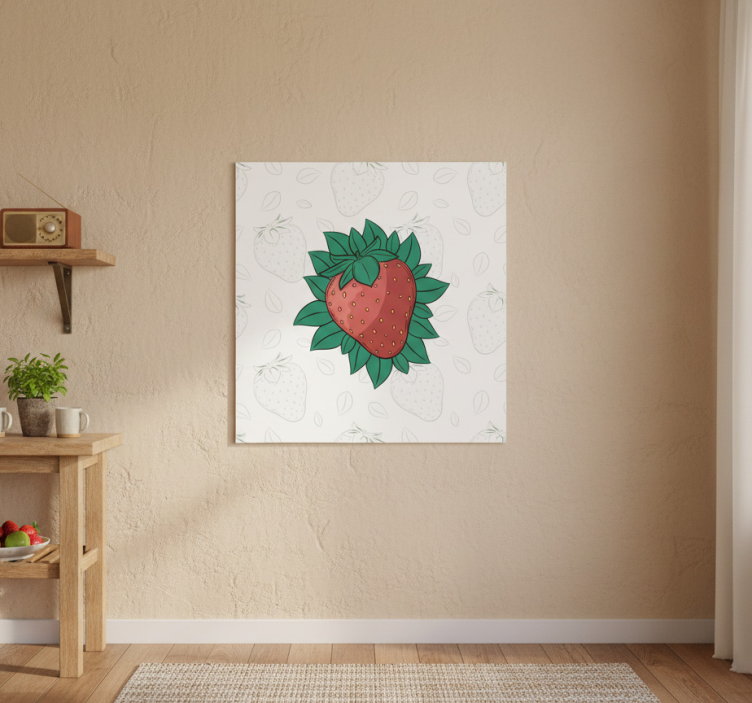 这幅生动的插图展示了一颗大型卡通风格的草莓,周围环绕着郁郁葱葱的绿色叶子。艺术作品的背景是淡色的,上面点缀着小草莓和叶子的淡淡轮廓。温暖的色彩和俏皮的设计营造出一种宜人、愉快的氛围,非常适合为任何空间增添一丝清新感。