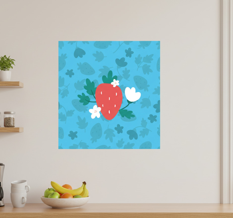 这幅生动的插图展示了一颗鲜艳的草莓,周围环绕着 stylized 绿色叶子和精致的白色花朵。背景是轻蓝色,点缀着细腻的叶子图案,这个设计体现了愉悦和清新的美感,非常适合为任何空间增添一种异想天开的氛围。