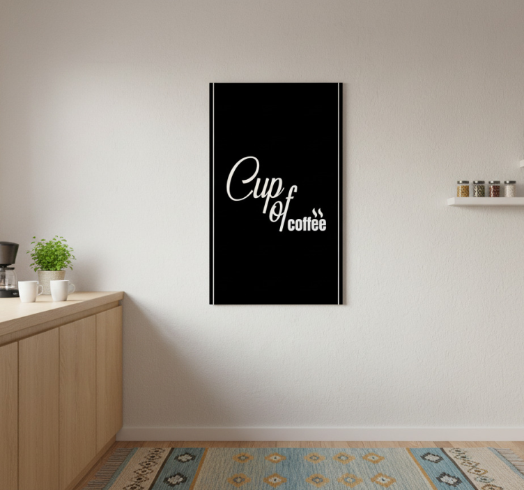 这幅图像展示了一件时尚的墙面艺术作品,突出了短语 'Cup of coffee' 的优雅字体。黑色背景增强了大胆的白色字母,形成了鲜明的视觉对比。周围的元素包括一个木质厨房台面,上面摆放着一小盆植物和一些餐具,营造出一种温馨的氛围。