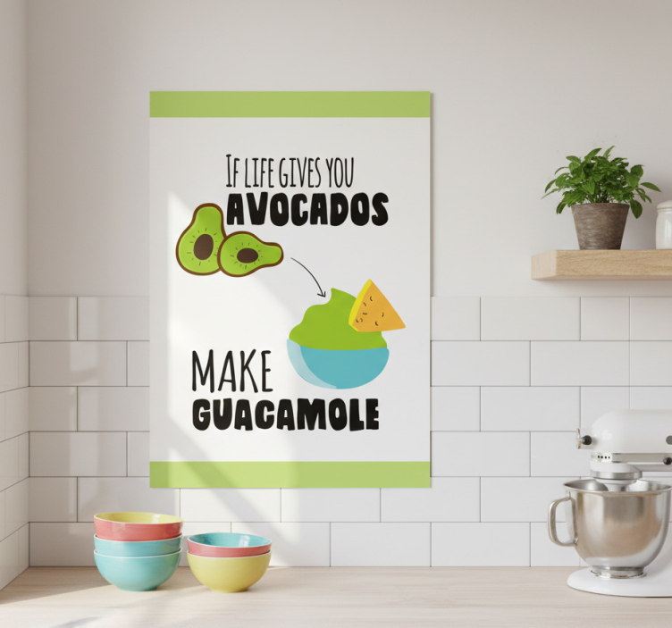 一幅生动的厨房海报传达了幽默的烹饪信息。海报上展示了风格化的鳄梨和一碗色彩缤纷的鳄梨酱,设计旨在激发烹饪的创造力。俏皮的文字鼓励将鳄梨转变为美味的鳄梨酱,反映了一种有趣的烹饪方式。这个引人注目的装饰品提升了任何厨房空间的魅力。