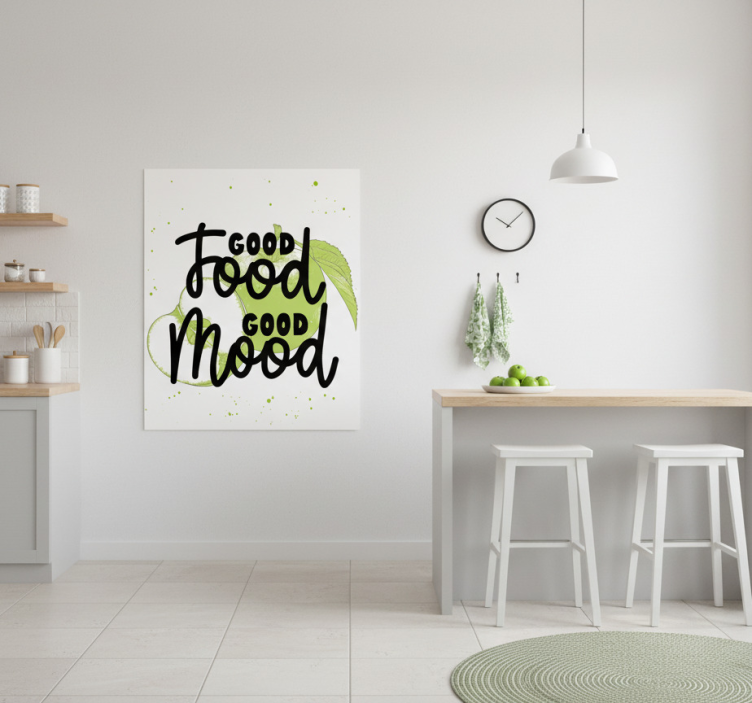 这幅图展示了一个极简风格的厨房场景,突显了一件时尚的墙面艺术作品。艺术作品以优雅的字体强调了短语‘Good Food Good Mood’,并用绿色调和叶子插图进行点缀。整洁的空间包括一个木质台面、吧台椅和装饰性的绿色元素,营造出清新宜人的氛围。