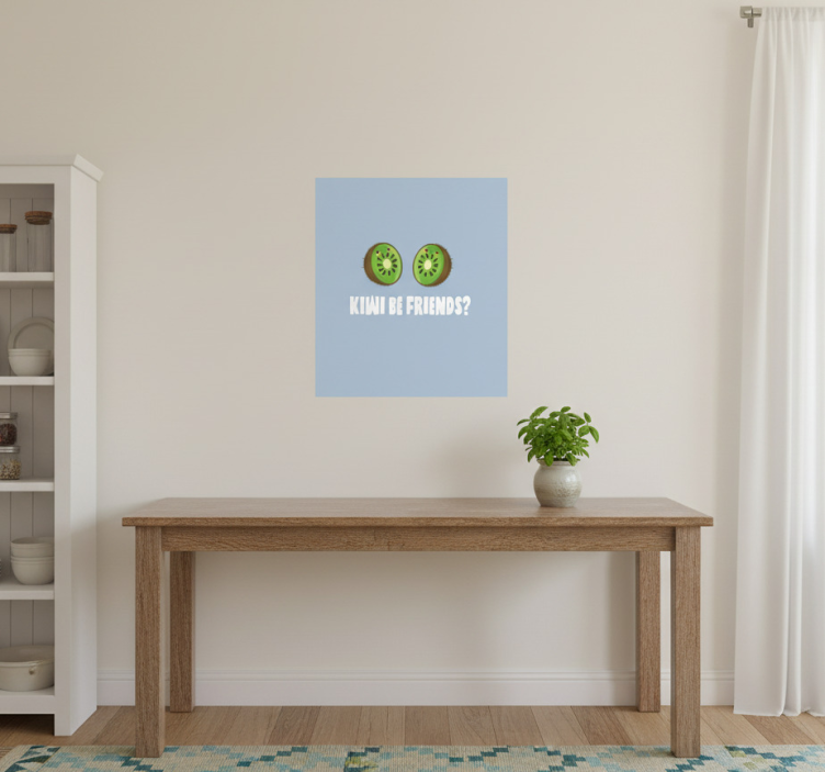 一幅充满趣味的艺术作品展示了两个表情可爱的猕猴桃,背景是柔和的蓝色。下面,俏皮的文字 'KIWI BE FRIENDS?' 为作品增添了轻松愉快的氛围,令人忍俊不禁。这件欢快的作品为任何空间增添了个性,结合了幽默与鲜艳的色彩,营造出愉悦的氛围。