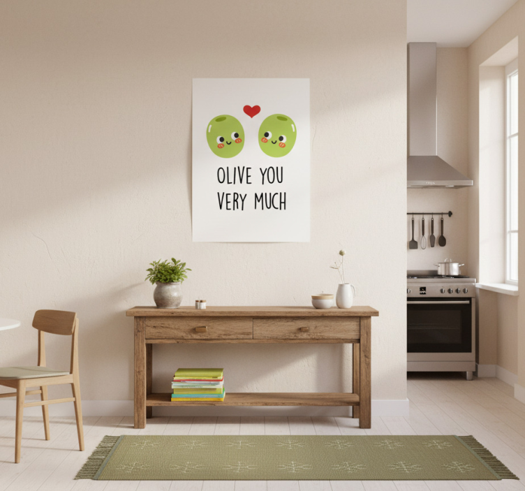 这幅迷人的图像展示了两个充满幻想、面带微笑的绿色橄榄,脸颊红润,头顶有一个心形图案。在这两个可爱的角色下面,俏皮的短语 'OLIVE YOU VERY MUCH' 以有趣的字体呈现。这些元素营造出轻松愉快的氛围,非常适合个人空间或作为礼物。