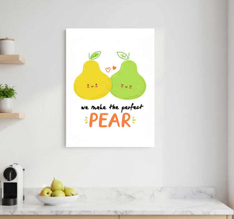 这幅迷人的插图展示了两颗可爱的梨子,一颗黄色和一颗绿色,面带愉快的表情。背景为白色,这幅充满趣味的艺术作品以短语 'we make the perfect PEAR' 为点缀,增添了一丝 whimsical 的感觉。非常适合家庭装饰,这个设计唤起了温暖和亲情。