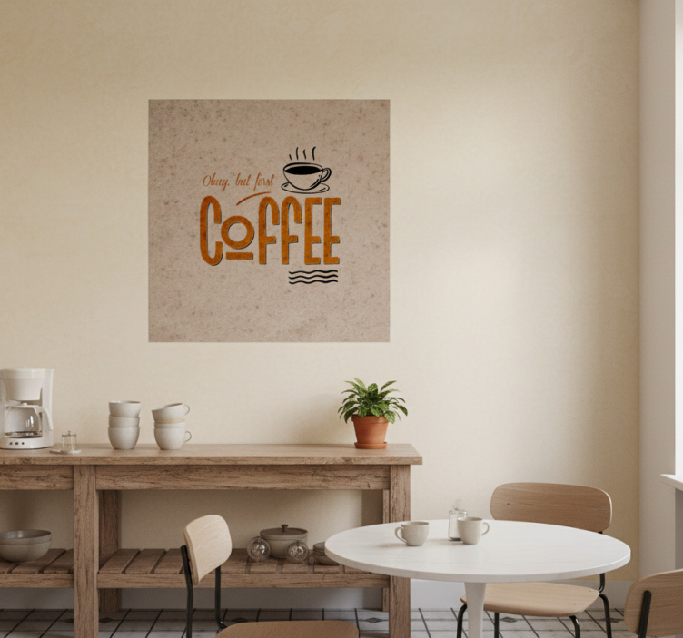 这个温馨的厨房场景展示了一幅迷人的墙面艺术作品,上面写着‘Okay, but first COFFEE.’温暖的色调与木制桌子和简约的装饰相得益彰。一盆小植物增添了清新感,而旁边的杯子和咖啡机则增强了宜人的氛围,非常适合咖啡爱好者。