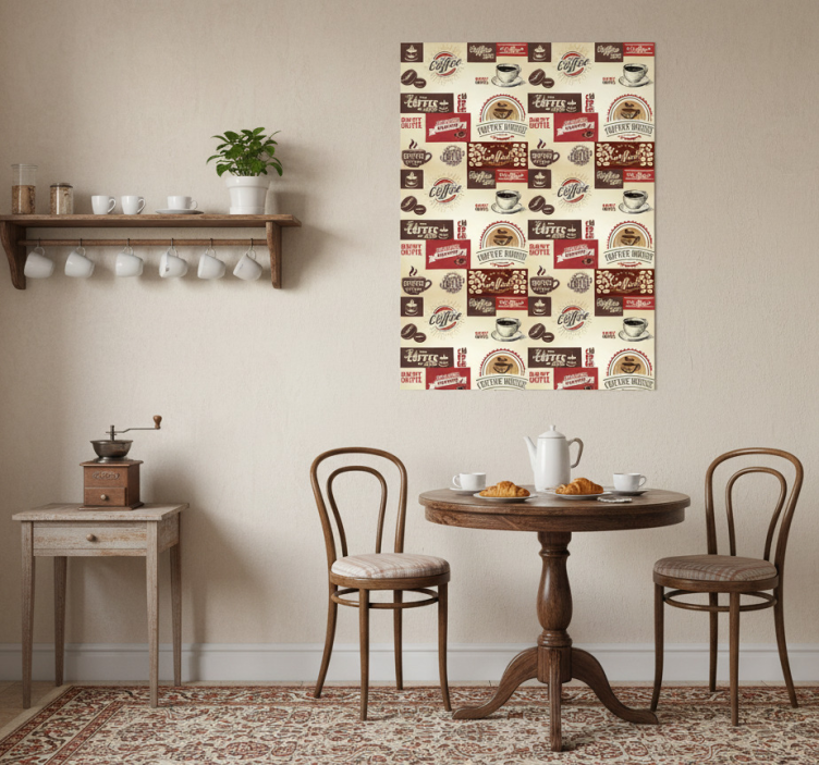 这个温馨的咖啡主题室内展示了一张木桌,搭配优雅的椅子,营造出一种舒适的氛围。墙纸上装饰着生动的咖啡相关图案,包含杯子、咖啡豆和俏皮的短语。一台迷人的咖啡研磨机和美味的糕点增添了温暖,非常适合在享用新鲜咖啡时享受宁静的时光。