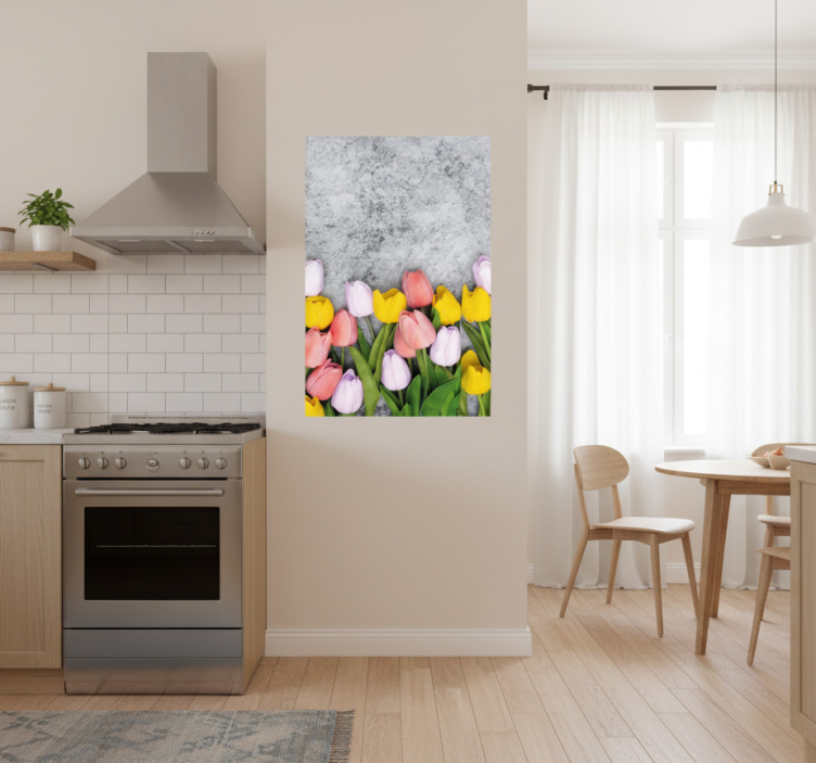 这幅生动的图像展示了一组令人惊艳的郁金香,色彩包括粉色、黄色和薰衣草色,背景是质感丰富的灰色。色彩斑斓的花朵成为了引人注目的焦点,提升了房间的美感。自然光线透入,为空间增添了温暖,增强了这个时尚空间的宜人氛围。