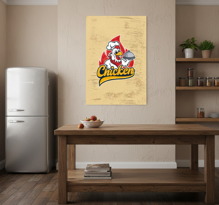 这幅图展示了一个充满活力的厨房场景,特色是一个富有趣味的鸡厨师标志。这个顽皮的角色头戴厨师帽,骄傲地在复古风格的背景下提供美食。鲜艳的色彩和质朴的纹理营造出温馨的氛围,非常适合在任何家庭或餐厅环境中激发烹饪灵感。