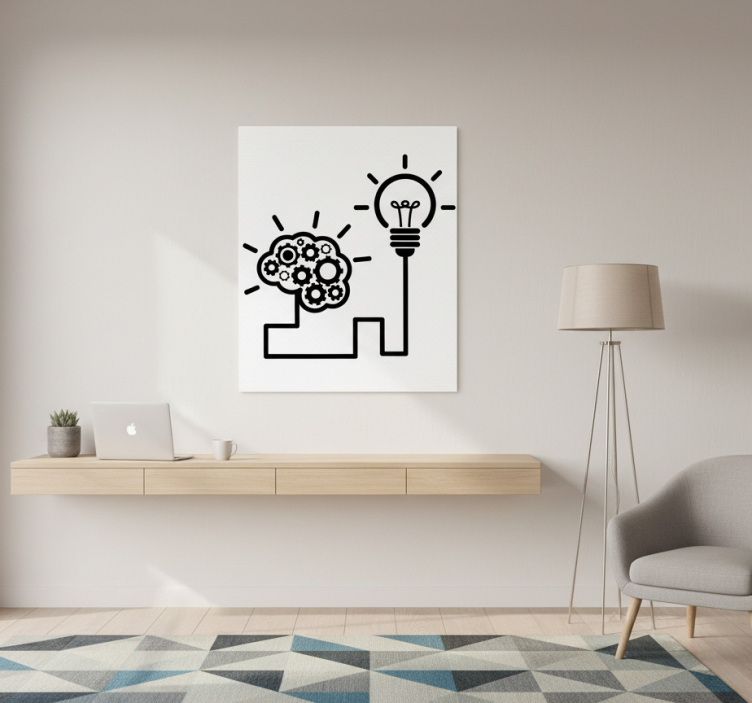这幅图像采用极简设计,展示了一个与灯泡相连的齿轮大脑。这件艺术作品显眼地展示在白色墙面上,而一套时尚的木桌和现代椅子则营造出一个精致的工作空间环境。自然光柔和地透入,增强了现代美感。