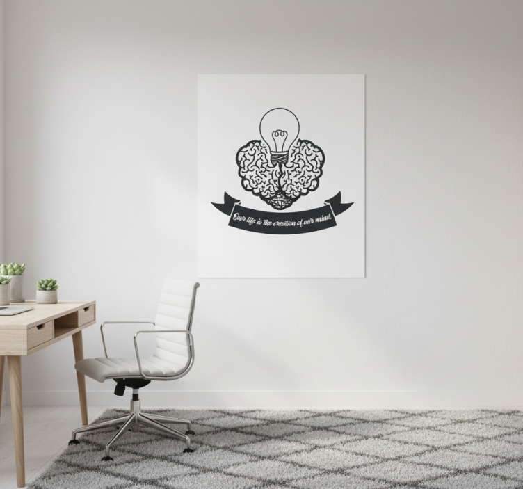 这幅图像展示了一件引人注目的墙面艺术作品,结合了灯泡和大脑的设计,象征着创造力和智慧。下面的横幅写着,'Our life is the creation of our mind.' 这件艺术作品陈列在一个现代化的工作空间中,为环境增添了鼓舞人心的氛围,同时促进了创新思维。