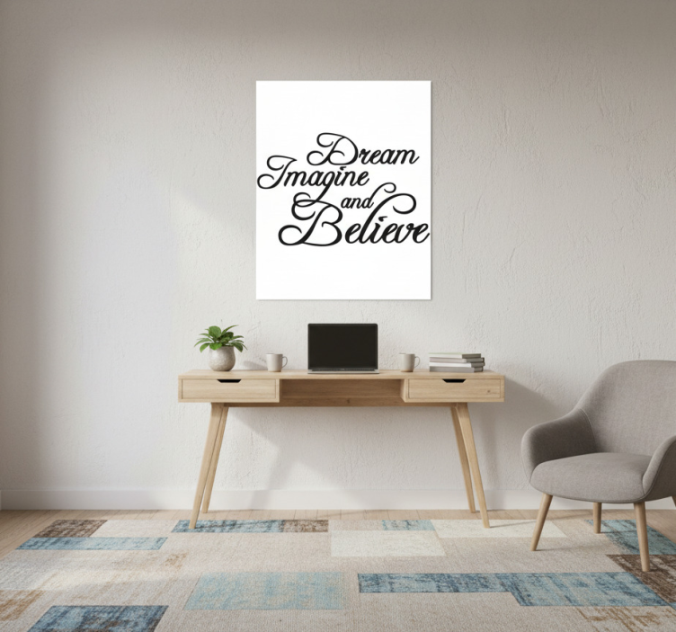 这幅图展示了一件鼓舞人心的墙面艺术作品,采用优雅的书法。它艺术性地交织着激励人心的短语'Dream'、'Imagine'和'Believe'。画面中可以看到一个极简风格的工作空间,桌子上放着一台电脑和两个杯子,搭配一块图案地毯,为环境增添了温暖。