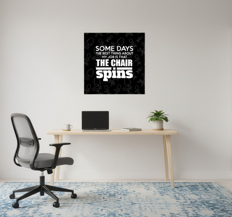 这张图片展示了一个时尚的工作空间,配有现代的书桌和符合人体工程学的椅子。墙上挂着一幅激励海报,上面清晰地写着:'Some days the best thing about my job is that the chair spins.' 这个幽默的说法为办公室环境增添了一丝趣味和个性。