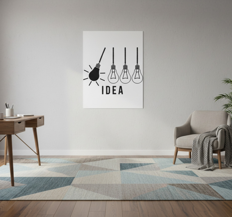 这幅图展示了一个现代室内,配有一把时尚的椅子和一张木桌。地面上铺着一块图案地毯,与房间的装饰相得益彰。一幅显眼的墙面艺术作品展示了单词 'IDEA' 和一个生动的灯泡图形,象征着当代工作空间中的创造力和灵感。