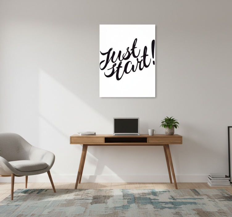 这幅图展示了一幅鼓舞人心的墙面艺术,特点是优雅流畅的字体写着‘Just start!’。背景是干净的白色,黑色字母有效地吸引了注意力。图中描绘了一个现代化的工作空间,配有一个舒适的椅子和木制书桌,营造出一个激励创造力和生产力的氛围。