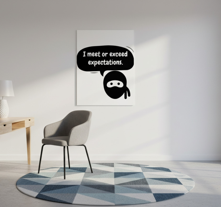 这幅图展示了一个现代的室内环境,里面有一把时尚的椅子和一块带有几何图案的圆形地毯。一件墙面艺术作品展示了一幅忍者插图,上面写着'I meet or exceed expectations',传达出一种古怪而又激励的氛围。自然光线增强了这个现代环境的氛围。