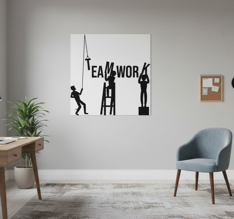 这幅图像描绘了团队合作的艺术表现,展示了三个人物共同努力拼凑“TEAMWORK”这个词。设计反映了团结与合作,具有对比鲜明的剪影,背景简约,为工作空间创造了激励氛围,促进了合作精神。