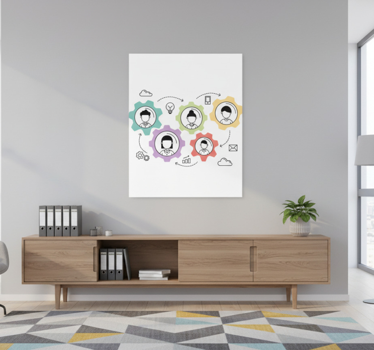 这幅图展示了一个现代工作空间,色彩缤纷的齿轮象征着团队合作与协作。每个齿轮内的插图人物代表着多样化的角色,创造性地连接在一起。各种图标描绘了沟通与思想分享,强调了专业环境中的协同效应。明亮的色彩和极简设计提升了创新与生产力的激励氛围。