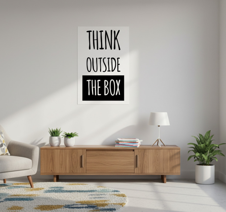 这幅图展示了一个现代客厅,配有时尚的木质橱柜、舒适的扶手椅和装饰性植物。墙上挂着一幅激励海报, boldly stating 'THINK OUTSIDE THE BOX',激发创造力和创新。柔和的灯光和多彩的地毯增强了温馨的氛围,使这里成为放松的完美场所。