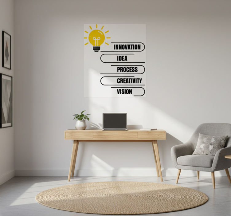 这幅图像展示了一个极简主义的工作空间,装饰着一个象征创意的灯泡插图。展示的关键概念包括创新、创造力和愿景,强调了一个充满活力和启发性的氛围。一张现代化的桌子上放着一台笔记本电脑和一盆植物,完美地营造出一个激发灵感和提高生产力的现代环境。