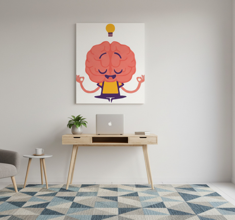 一幅异想天开的插图描绘了一个卡通脑袋,散发出放松和创造力。脑袋位于中央,面带愉悦的表情,正在冥想。上方,一个灯泡象征着创意和灵感。背景是一个干净、简约的工作空间,增强了专注力。这幅图像反映了智慧与正念的结合。